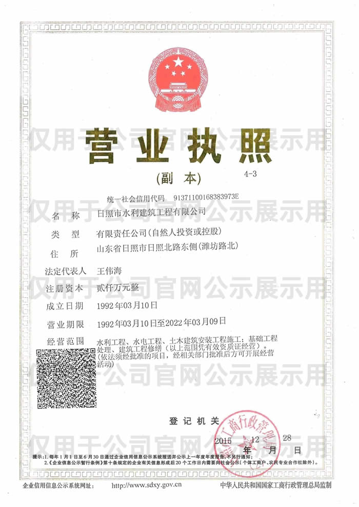 日照市水利建筑工程有限公司前身為日照市水利局安裝隊(duì),隸屬于日照市水利局,成立于1992年3月,注冊(cè)資本2000萬(wàn)元,主要從事水利工程施工。公司現(xiàn)有從業(yè)人員180余人,其中高級(jí)工程師10人,中級(jí)工程師46人,助理工程師52人,一級(jí)建造師3人,二級(jí)建造師17人,公司年可完成建筑安裝產(chǎn)值超1.5億元。公司現(xiàn)擁有水利水電施工總承包貳級(jí)資質(zhì),并先后通過(guò)了質(zhì)量管理體系認(rèn)證ISO9001:2015、環(huán)境管理體系認(rèn)證ISO14001:2015、職業(yè)健康管理體系ISO45001:2018等體系認(rèn)證,2020年12月榮獲山東省水利廳“水利安全標(biāo)準(zhǔn)化二級(jí)單位”等證書(shū)。